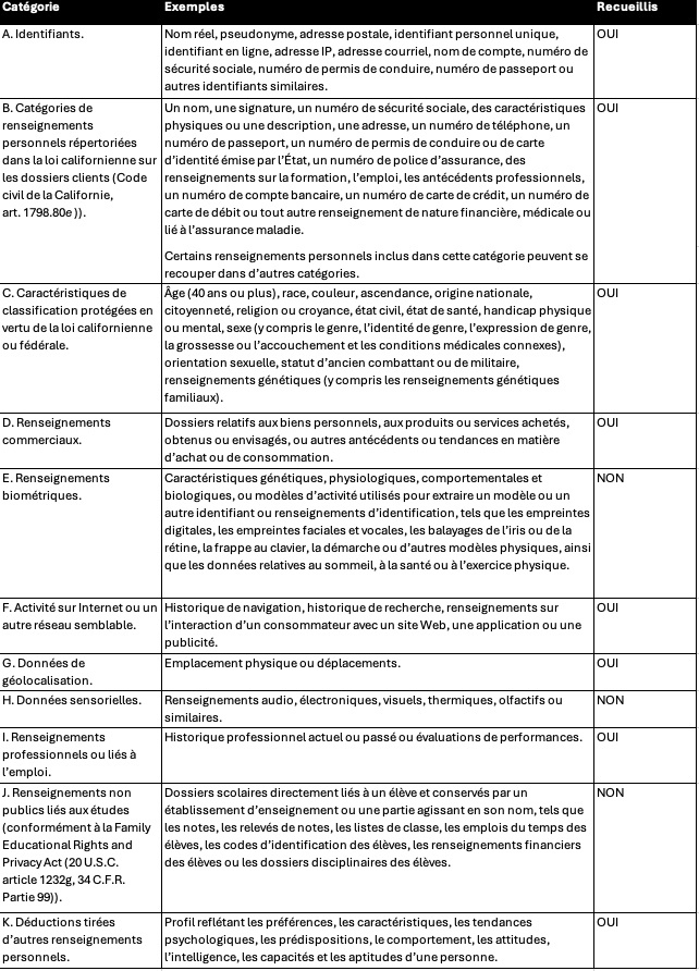 Nous recueillons des renseignements qui identifient, concernent, décrivent, peuvent raisonnablement être associées ou pourraient raisonnablement être liées, directement ou indirectement, à un consommateur ou un foyer particulier (« renseignements personnels »). En particulier, nous avons recueilli les catégories suivantes de renseignements personnels auprès des consommateurs au cours des douze (12) derniers mois :