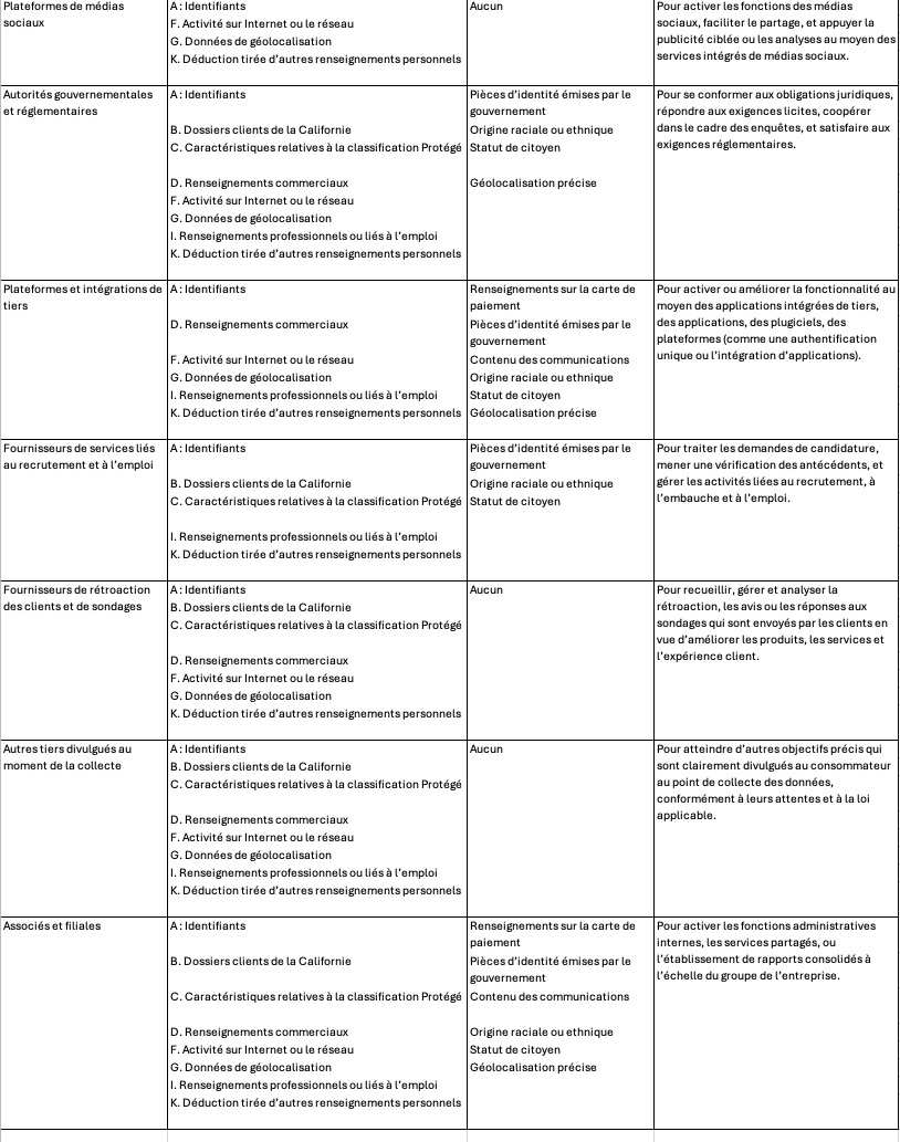 Nous partageons les renseignements personnels avec des tiers à des fins de publicité comportementale avec suivi inter-site. Le partage de nos renseignements personnels ne comporte pas les renseignements au sujet des consommateurs qui, à notre connaissance, sont âgés de moins de 16 ans. Le tableau ci-dessous indique les catégories de tiers avec qui nous avons partagé les renseignements personnels des consommateurs aux fins de publicité comportementale avec suivi inter-sites au cours des 12 derniers mois.